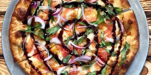 Handpicked vine-ripened tomatoes, red onions, the crust has been lightly brushed with our signature freshly roasted garlic sauce, Fine Folk premier mozzarella blend, garnished with fresh basil and a balsamic vinaigrette reduction.