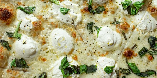 Ricotta, Fine Folk premier mozzarella blend, fresh basil, and lightly brushed with our signature fresh roasted garlic sauce. White pizza has never been this good.
