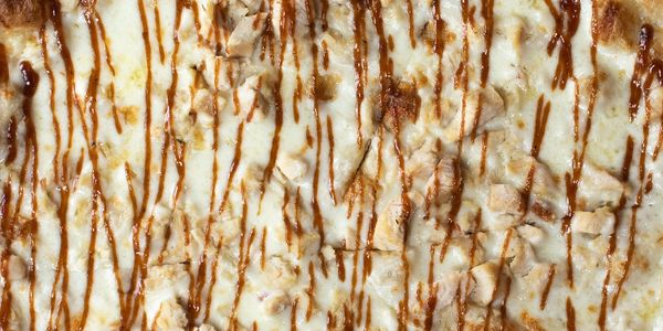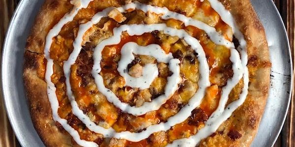 Oven roasted chicken, applewood smoked bacon, ranch dressing swirl on top, hot sauce base and swirl on top, Fine Folk premier mozzarella blend, Monterey jack cheese, and cheddar cheese.