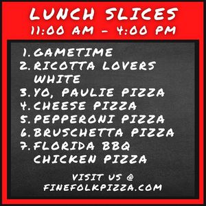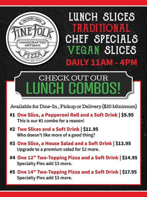 Personal Pies for everyone! Get a 14" Folk Art Pizza with up to four traditional toppings, or any Specialty Pizza. (Upgrade to 16" for $5 more, 18" for $7 more, and make it Vegan for $3 more